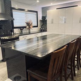 Install cabinets, countertop, tile backsplash, flooring, lighting